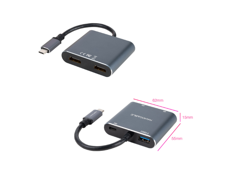 Tu nuevo ordenador se expandirá gracias a nuestro conversor Nanocable. Amplía las entradas de tu dispositivo, a través de un solo puerto USB-C tendrás dos puertos HDMI, un puerto USB-A 2.0 y otro USB-C de carga. ¡Suma y sigue!