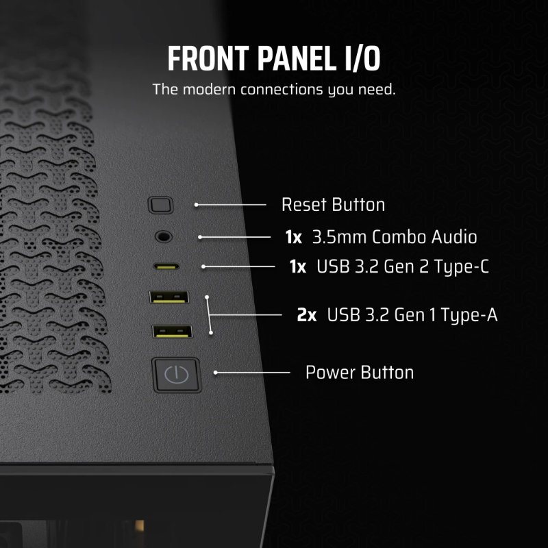 Case Front IO: (1x) USB 3.2 Gen 2 Type-C, (2x) USB 3.2 Gen 1 Type-A, (1x) Audio in/out