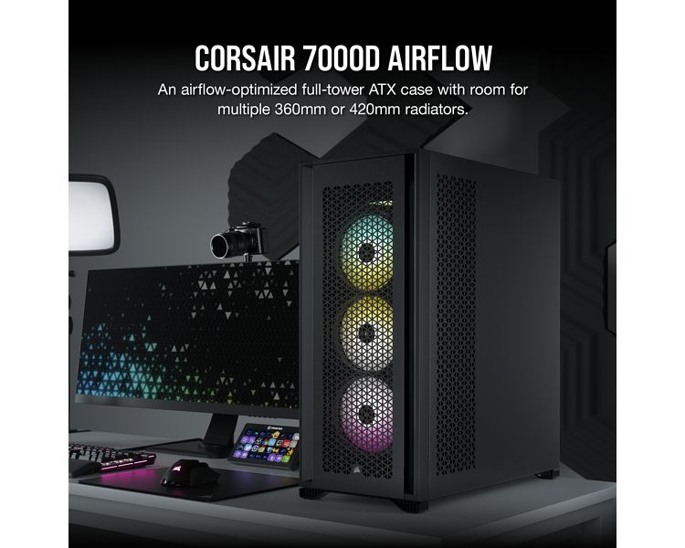 El CORSAIR 7000D AIRFLOW es un chasis ATX tipo torre para los diseños más ambiciosos, dotado de un panel frontal de acero que optimiza el flujo de aire y consigue la mayor entrada de aire, así como de tres ventiladores AirGuide de 140 mm incluidos. El sistema de gestión del cableado CORSAIR RapidRoute oculta los cables fácilmente, mientras que su amplio interior permite optar por varias alternativas de refrigeración, pues cuenta con espacio para un máximo de tres radiadores de 360 mm a la vez.