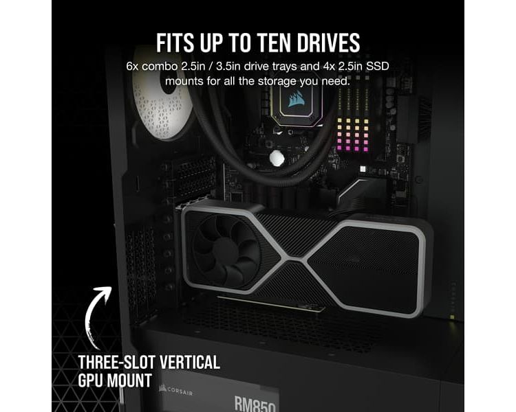 Equipado con tres ventiladores CORSAIR AirGuide de 140 mm (incluidos) con aspas antirremolinos que concentran el flujo de aire.