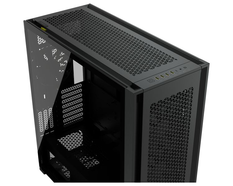 Dos paneles de acero de gran flujo de aire y un robusto panel lateral de cristal templado de 4 mm de grosor ofrecen un flujo de aire increíble y una vista despejada de su sistema.