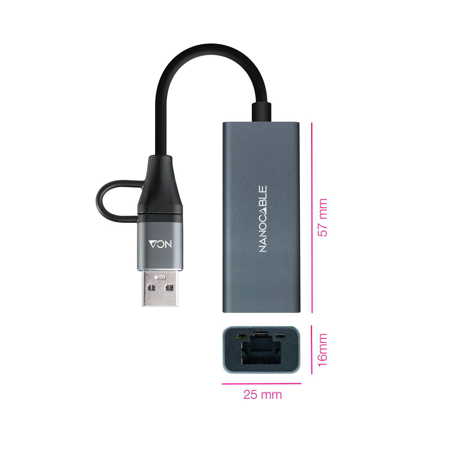 Conversor USBC/USBA a RJ45 Gigabit / 1000 Mbps / Plug&Play / 15 cm / Gris