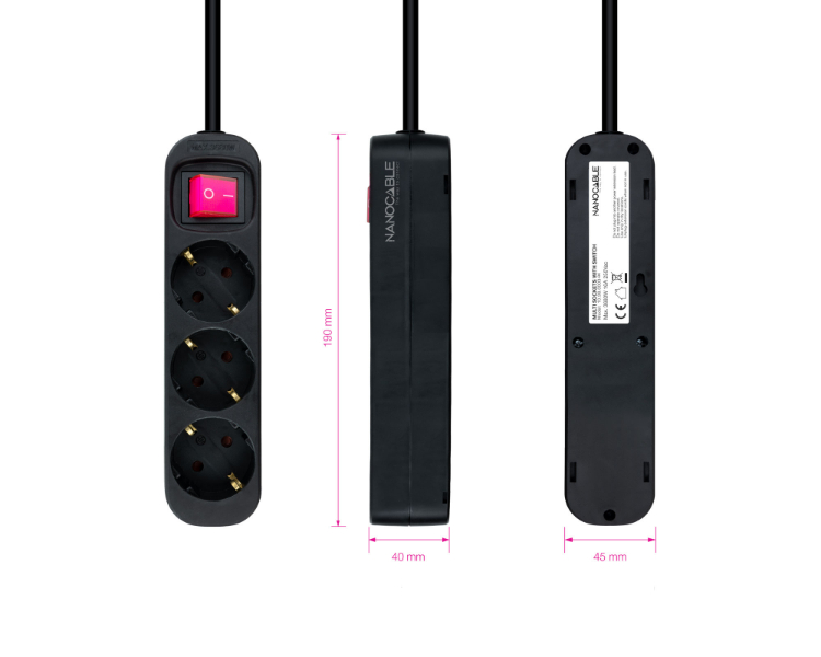 REGLETA PROTECTORA 3 TOMAS CON INTERRUPTOR NEGRO NANOCABLE
