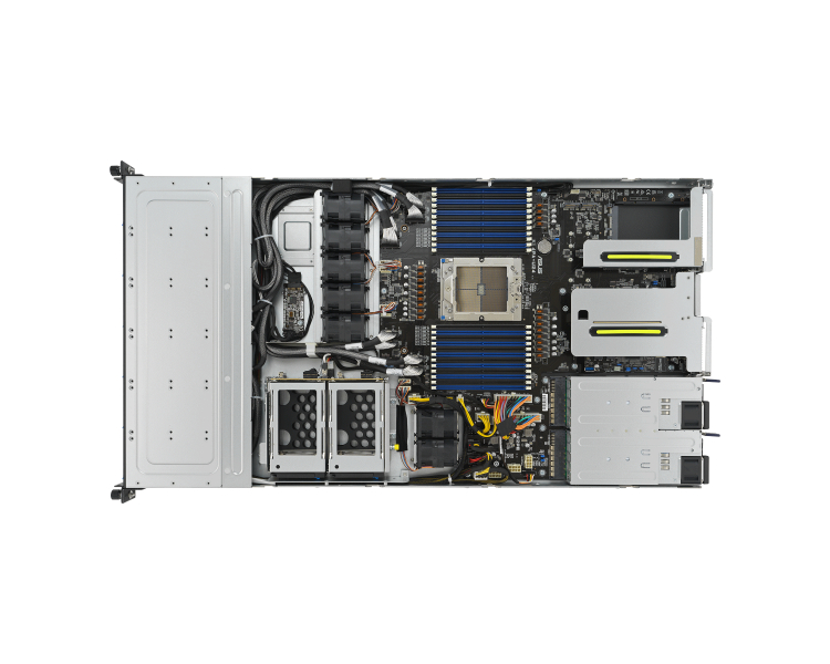 Diseño de almacenamiento y expansión escalable: hasta 12 unidades NVMe all-flash en el panel frontal, 4 NVMe en el compartimento central y 3 ranuras PCIe 5.0 para mayor ancho de banda y actualización del sistema